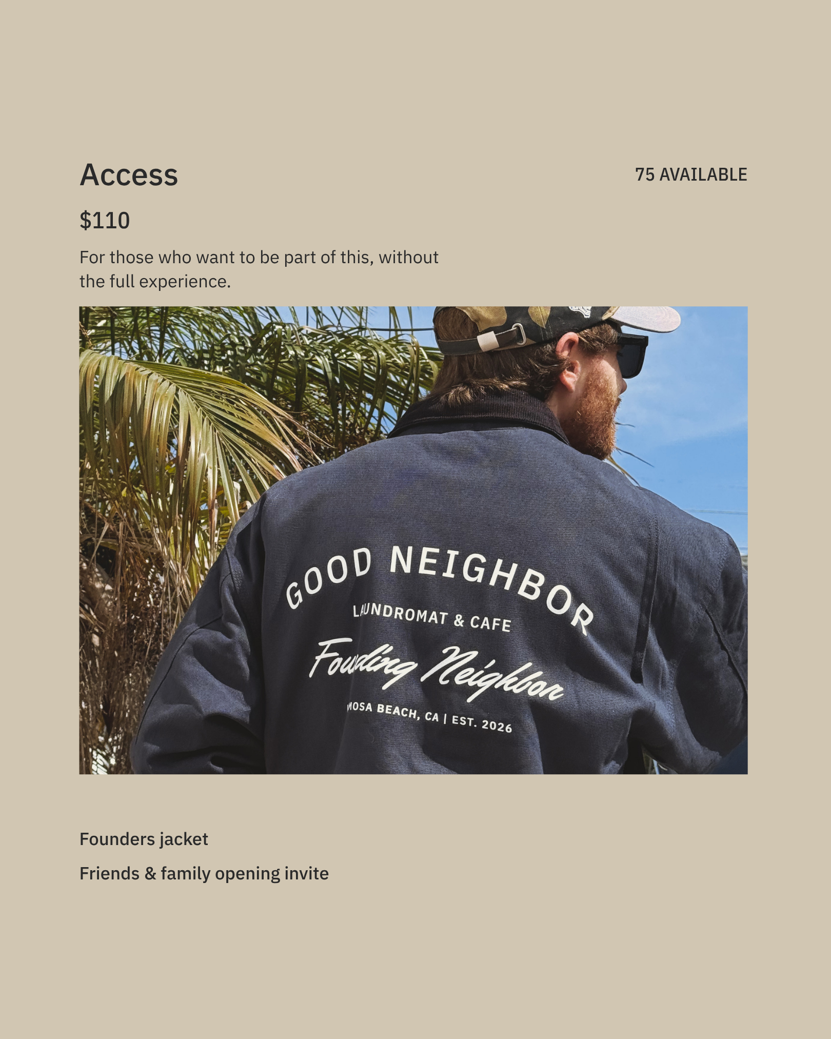 We’re opening Good Neighbor Laundromat & Café in Hermosa Beach this Spring, and we’re inviting a limited group of people to be part of it from the very beginning, and help shape our community. The Founders Club is a one-time release with included perks, credits, and special access – dropping on April 9th, 2026. Join the waitlist to get notified first.