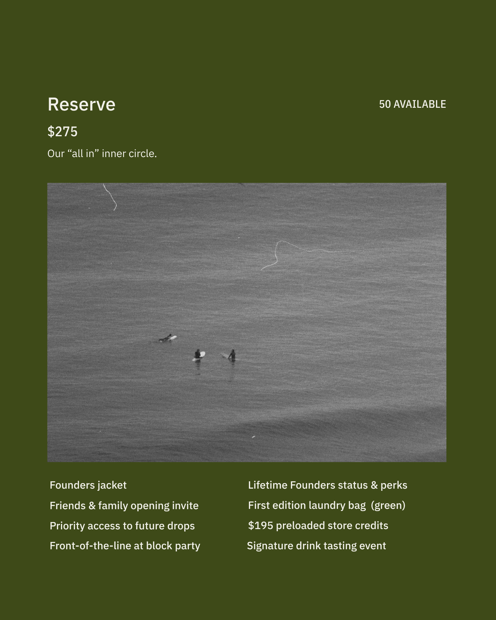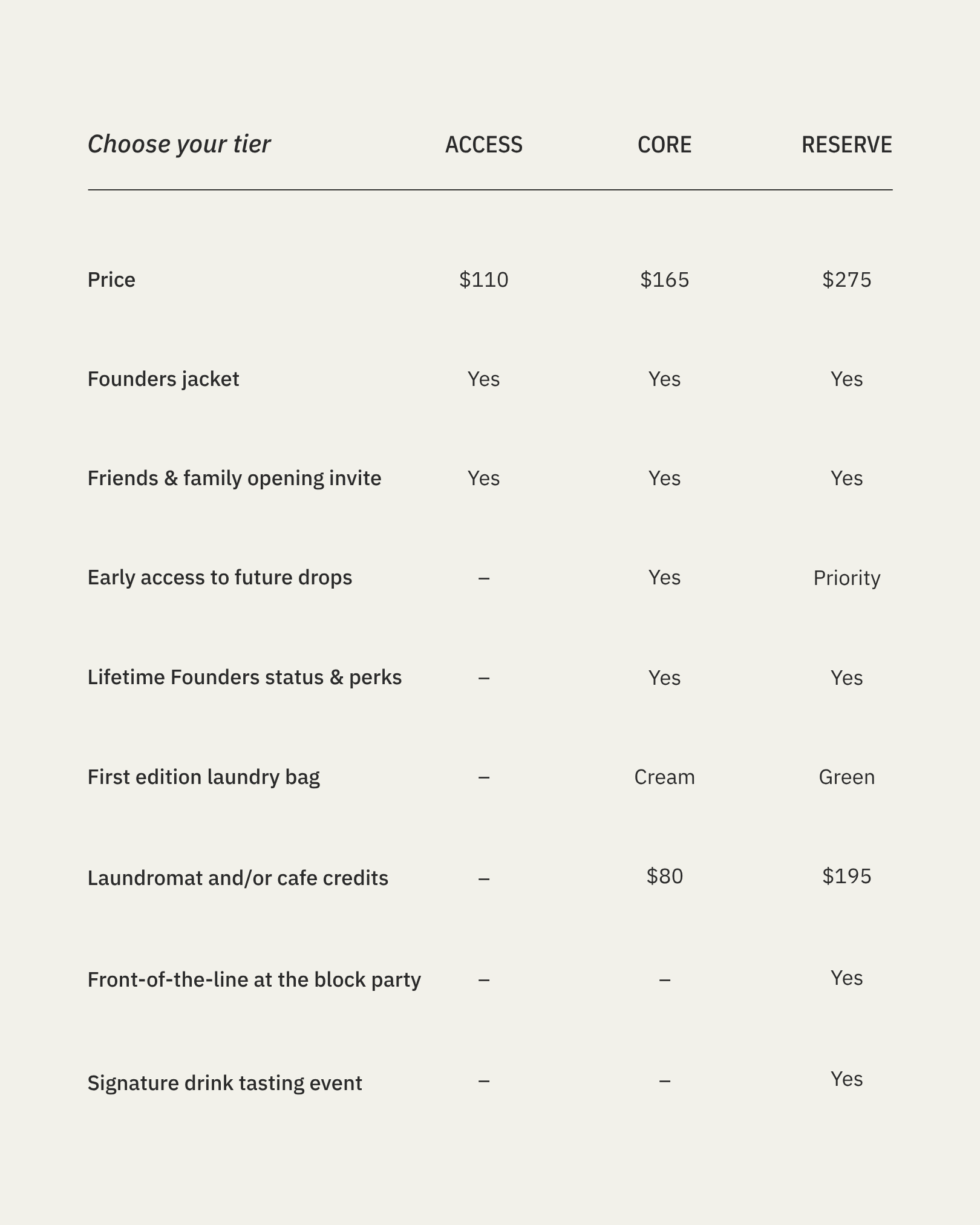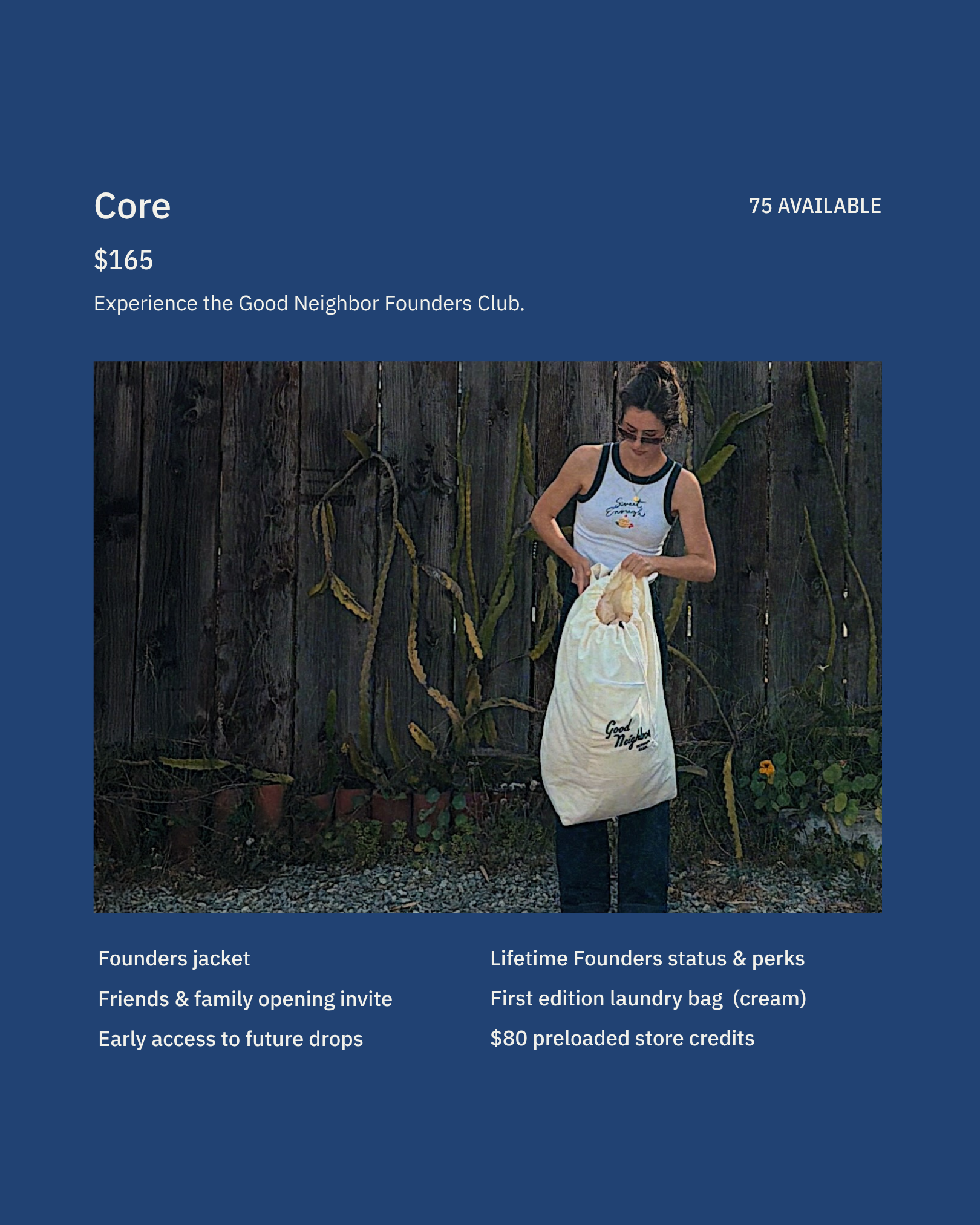 Each tier includes the Founders jacket and early access to Good Neighbor before we open to the public. Higher tiers include additional perks like preloaded credits, first-edition bags, and invitations to special events.